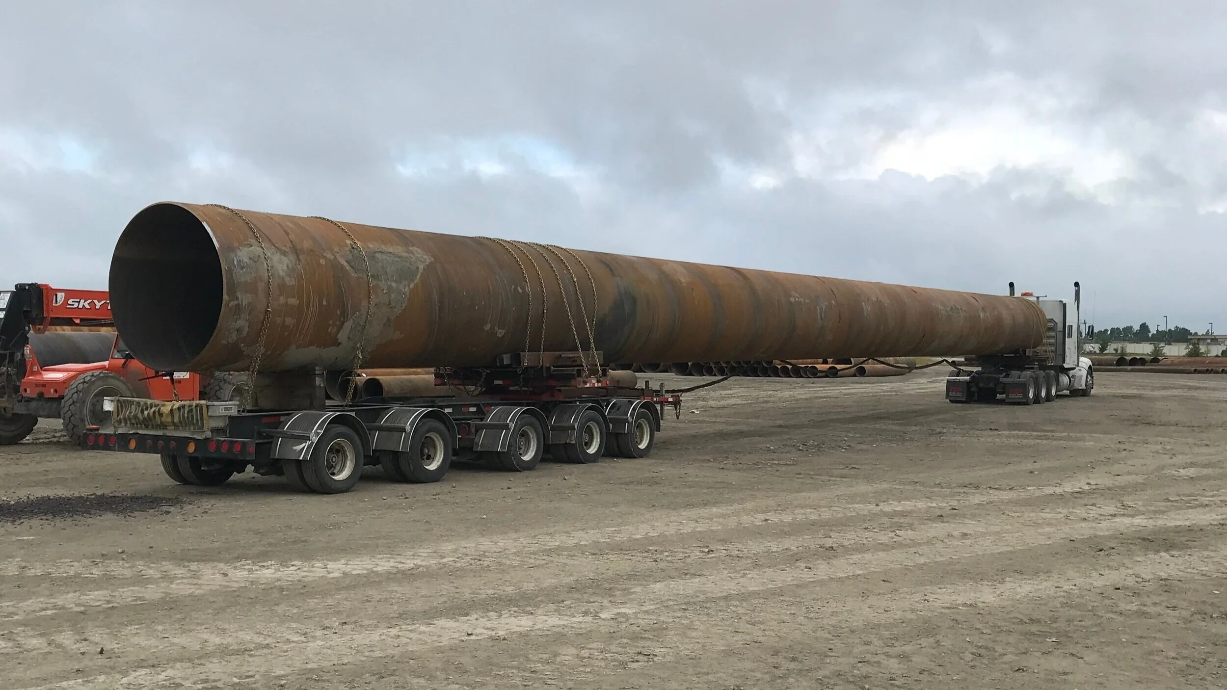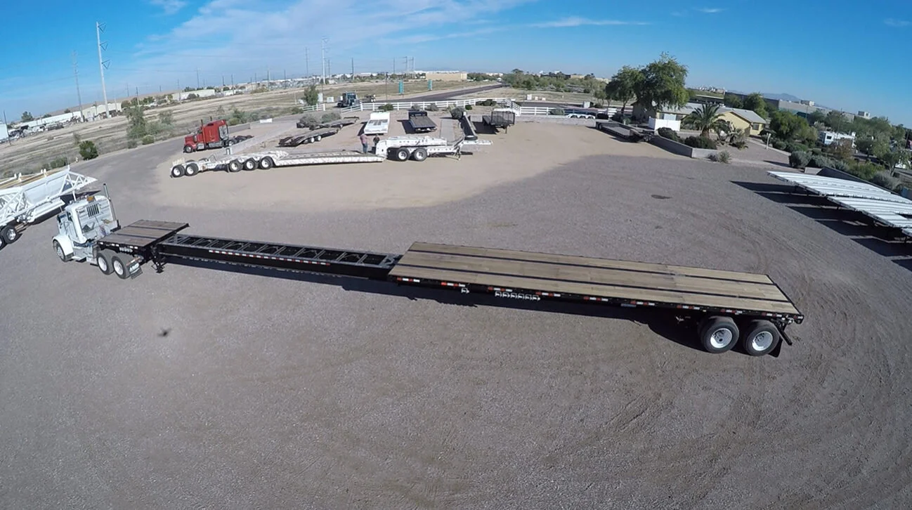 The ‘Stretch’ trailer has the exact dimensions of flatbed trailer but includes the ability to stretch out to 70-90 feet. This important for over-length loads for two reasons, permissible over-hang is generally only 3-5 feet, and this allows the load weight to properly be distributed throughout the trailer’s axles.